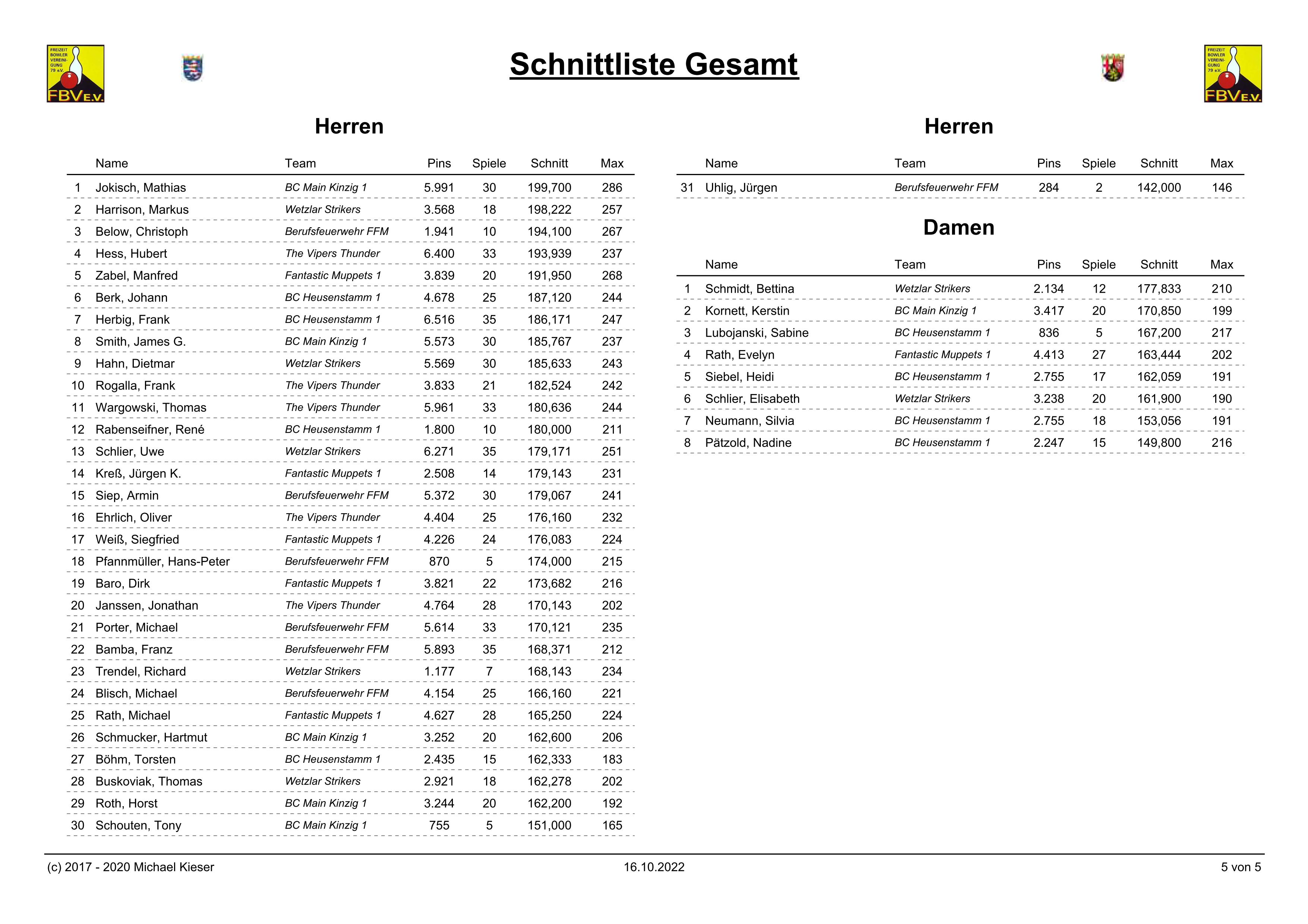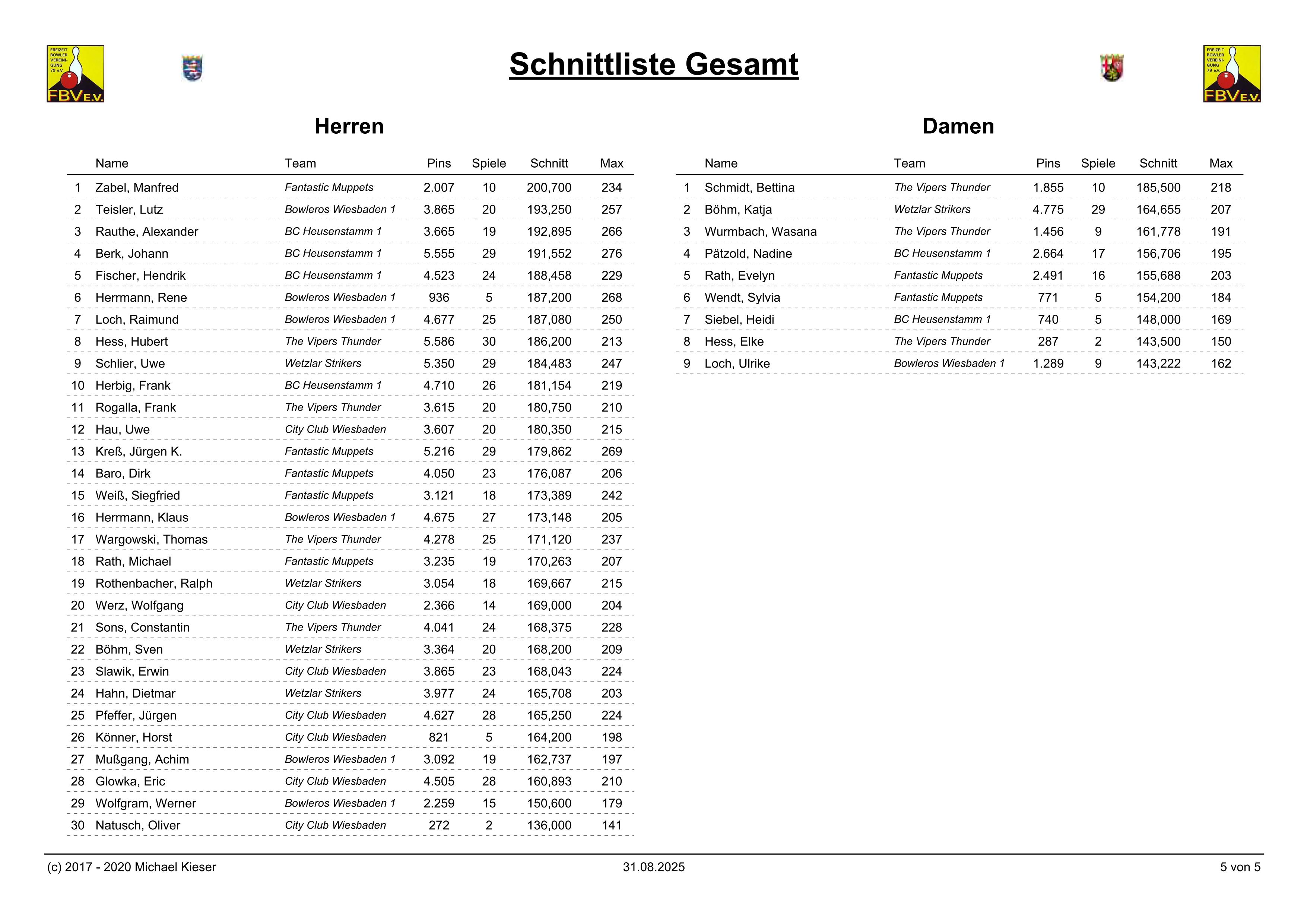 In 5 Spielen 892 Pin, ein Schnitt von 178,4 Pin; Höhstes Spiel 203 Pin